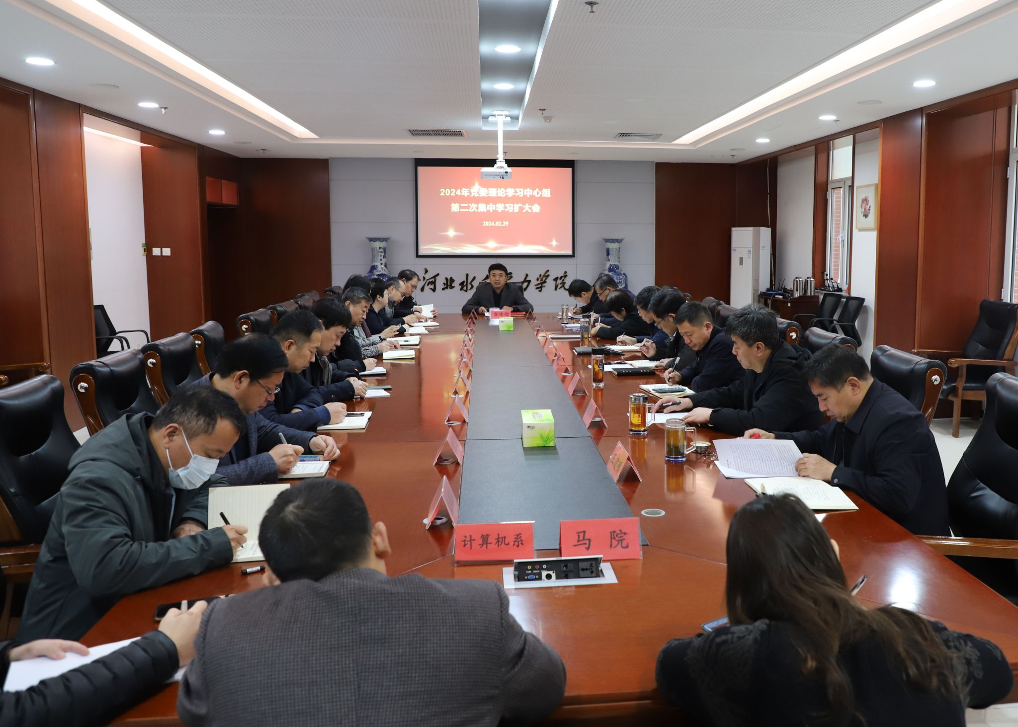 2月29日上午,我校召开2024年党委理论学习中心组第二次集中学习扩大会,学习习近平总书记在中共中央政治局第十一次集体学习时的重要讲话精神、习近平总书记在《求是》杂志发表重要文章《完整、准确、全面贯彻落实关于做好新时代党的统一战线工作的重要思想》以及《党史学习教育工作条例》三项内容。党委书记张效松主持会议,党委理论学习中心组全体成员、学生工作部、教师工作部、马克思主义学院负责人以及各系党总支书记参加会议。...