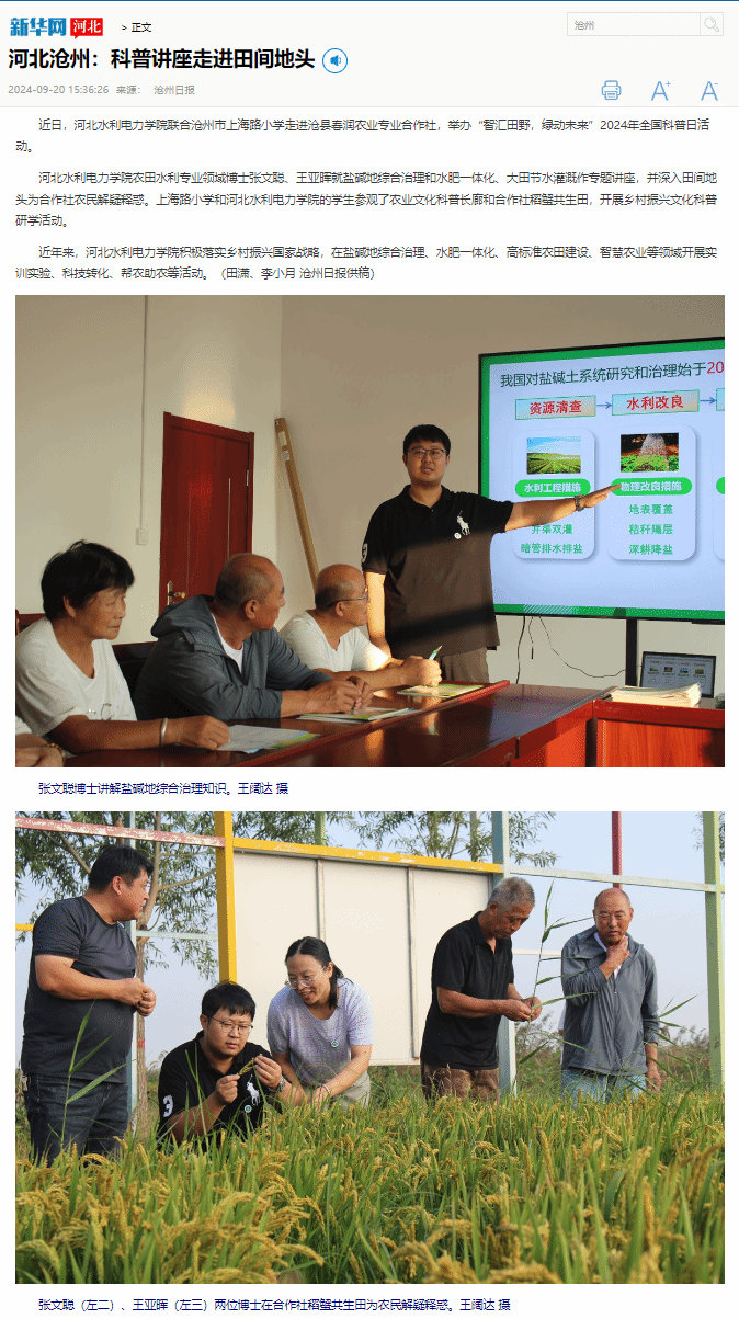 9月19日下午,一场由我校水利工程系张文聪博士与王亚晖博士主导的,以“智汇田野,绿动未来”为主题的全国科普日活动在沧县春润农业专业合作社拉开帷幕,活动旨在向当地农户传播科学知识,普及先进技术,通过高端科技力量赋能乡村振兴,加速推进农业强国建设。在春润合作社一楼会议室,张文聪博士为大家开展了《农业高效利用盐碱地资源探讨》的主题讲座,深入浅出地讲解了盐碱地改良的最新研究成果与技术路径,为农民们打开了盐碱地变良田的新视野。...