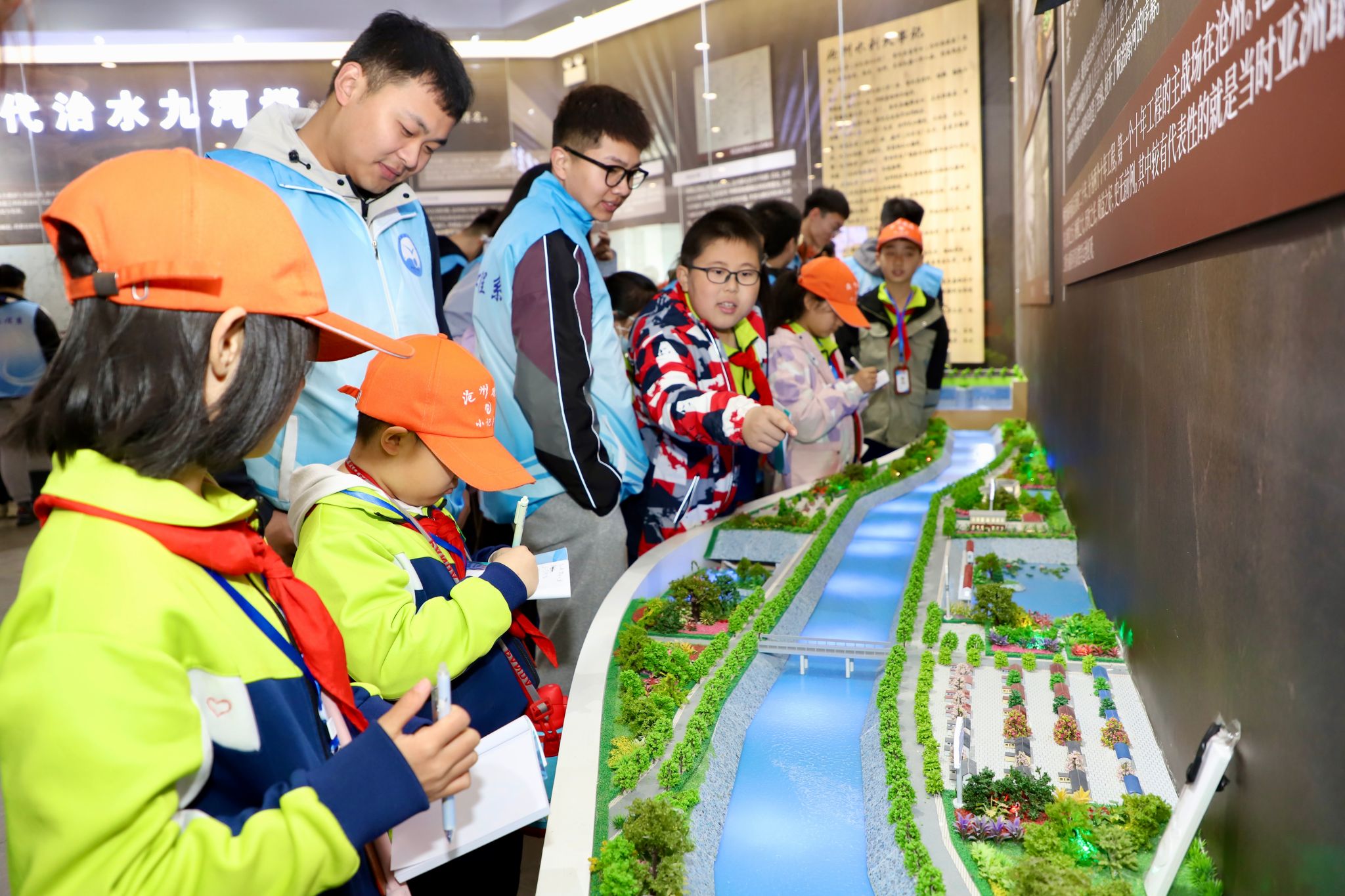 活动伊始,水利工程系副主任王凤春给大朋友和小朋友们介绍了大运河上的穿运工程——南排河倒虹吸工程,通过虹吸原理,使得南北走向的大运河和东西走向的南排河顺利穿运、互不干扰,让同学们了解到水利工程的魅力。接着,我校水利工程系学生与上海路小学学生“结对”参观了沧州水利文化展示馆,学习了沧州人民尊重自然、改造自然,把严重水患之地建设成人水和谐共生幸福之城的奋斗历程。活动中,大学生们为小学生们讲解水利知识,小学生们认真记笔记、做总结,师生们在这里充分感受了新时代的治水精神。最后,师生们来到了观鸟台,欣赏了“白鹭成群,芳草萋萋”的美景。近年来,随着沧州市大运河文化带的建设,水更清了、树更绿了、生态更美了,“人与自然和谐共生”的生动画面在这里充分展现。
