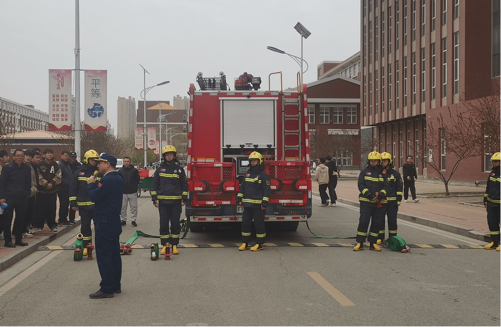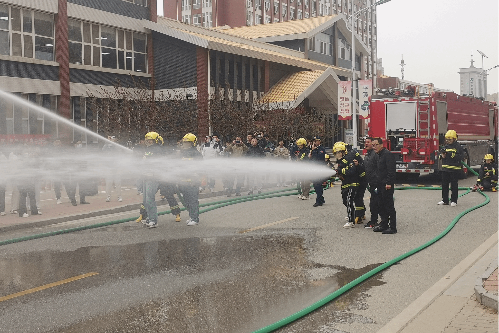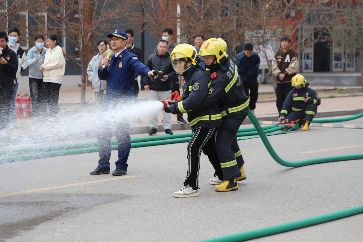 为完善学校火灾扑救和组织人员疏散逃生工作预案,帮助我校各级消防安全责任人、管理人员掌握开展灭火和疏散演练的程序方法,提高师生员工使用校内消防设施器材的能力,熟悉疏散逃生路线,掌握疏散逃生技能,增强师生员工消防安全意识。4月1日下午,在沧州市消防救援支队赵江奎高级工程师和8名消防员现场指导下,我校开展了火灾疏散逃生和灭火演练活动。学校党委书记张效松,党委副书记、校长王滨,副校长崔立功,纪委书记方敏,副校长杨凯到场指导,学校400余名师生员工参加了本次演练。