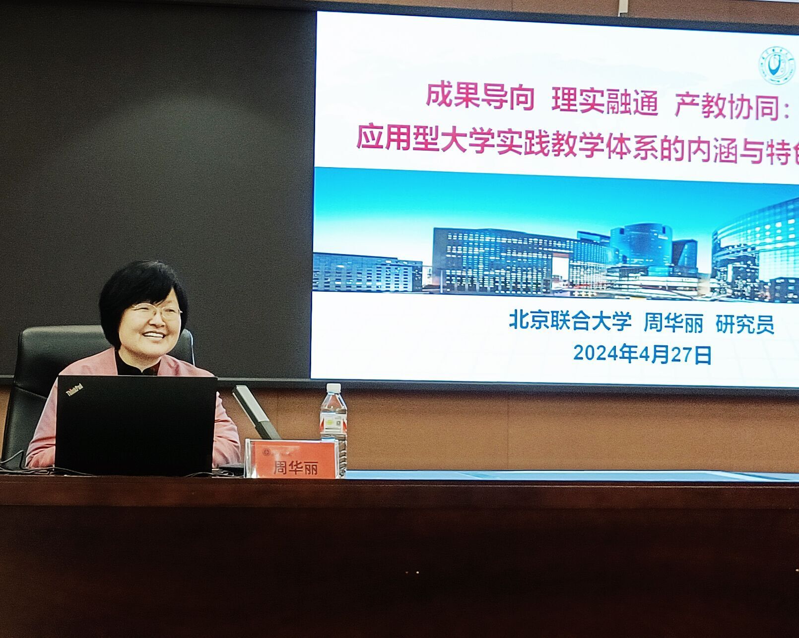 周华丽研究员就“成果导向 理实融通 产教协同:应用型大学实践教学体系的内涵与特色建设”主题,立足应用型大学围绕产教融合、产教协同、成果导向、理实融通,从人才培养方案修订、专业实践教学体系构建、实践教学项目开发、实践教学场景建设、实践教学质量评价五个方面进行了充分的阐述,内容丰富详实、实用性强,为我校当前本科教学工作合格评估、专业建设面临的实际问题、探索产教融合的适配路径明晰了目标,指明了路径。