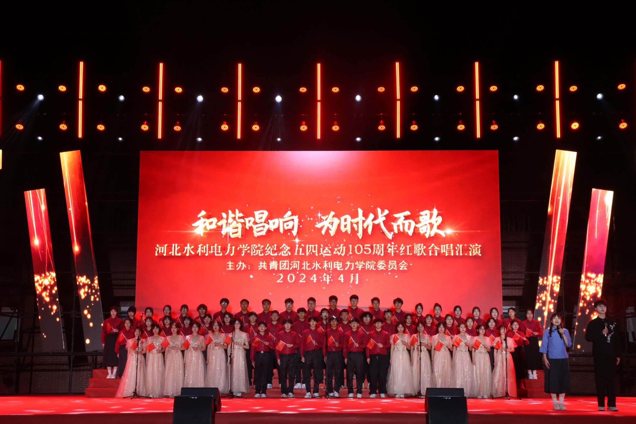 在热烈的掌声中,8868·电子(中国)官方网站2024年五四红歌汇演拉开帷幕。首先,张烨老师和大学生艺术团带来了精彩表演,青春洋溢的歌声为晚会营造了热烈的氛围。由水利工程系带来的《英雄赞歌》和《最可爱的人》点燃了现场观众的激情。《爱我中华》、《歌唱祖国》、《红旗飘飘》等一首首经典歌曲,将同学们的思绪拉回了一百多年前的青葱岁月,飞扬的歌声吟唱着难忘的岁月,熟悉的旋律演绎着时代的乐章。由交通工程系带来的歌曲《没有共产党就没有新中国》和《灯火里的中国》将现场气氛推向高潮。悠扬的旋律,洪亮的歌声,回放着岁月的记忆,引领着爱党爱国的豪情。