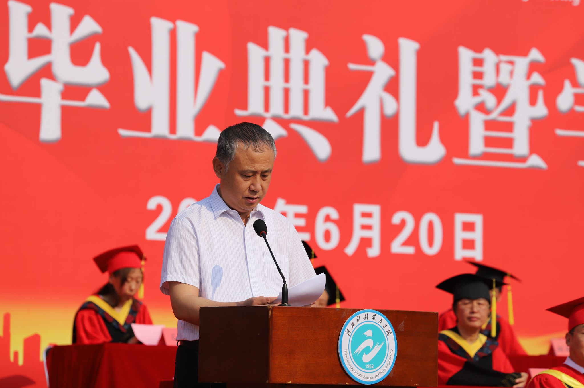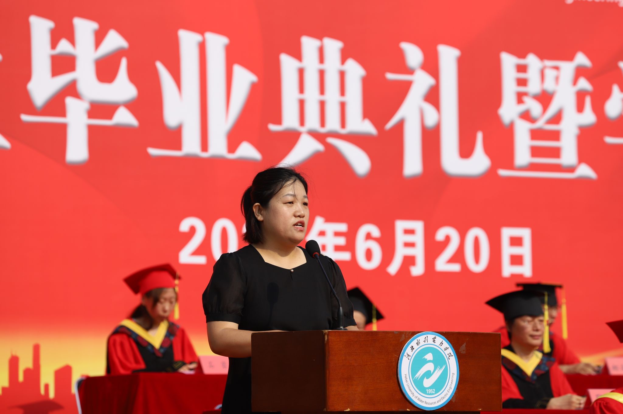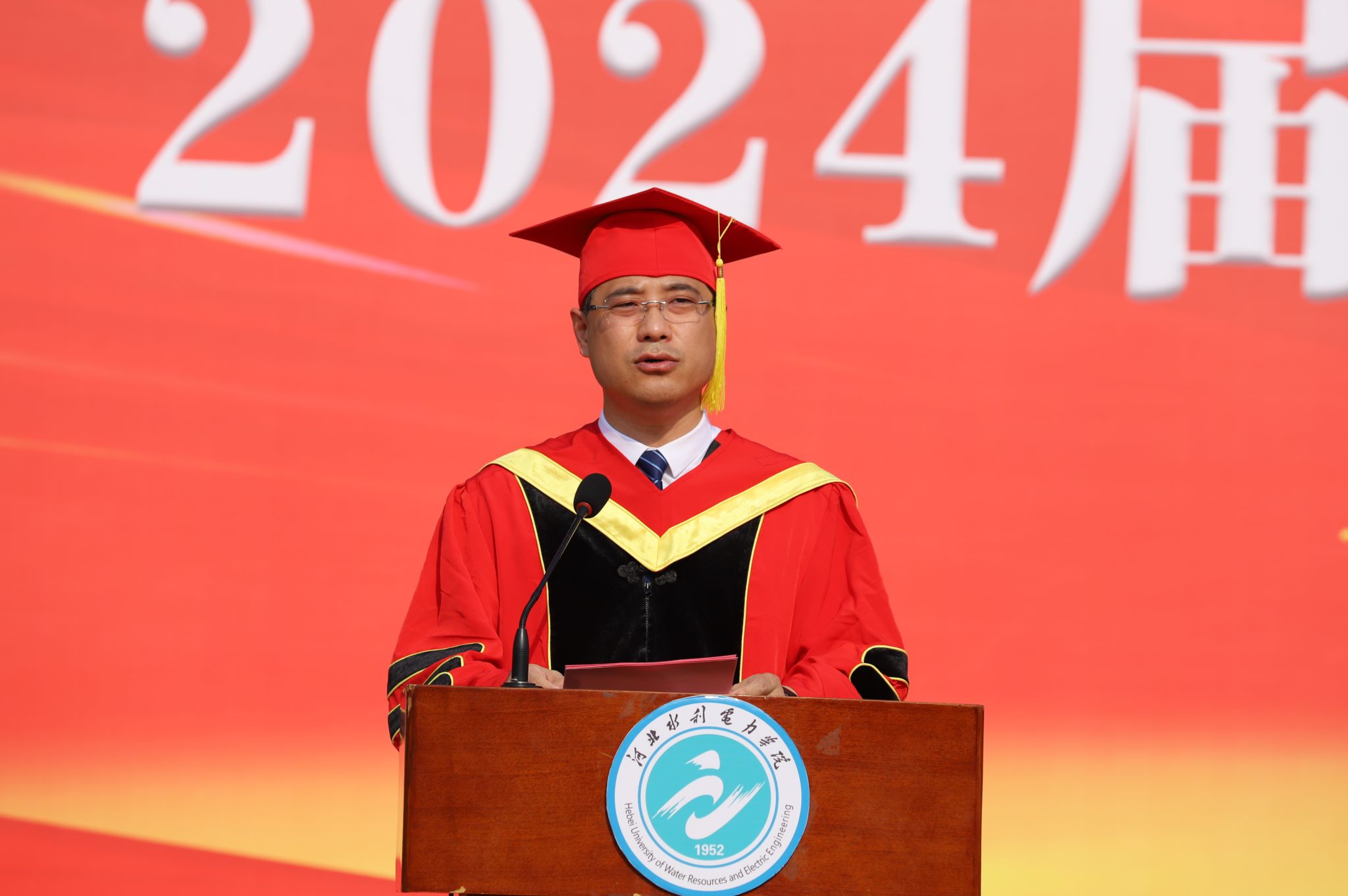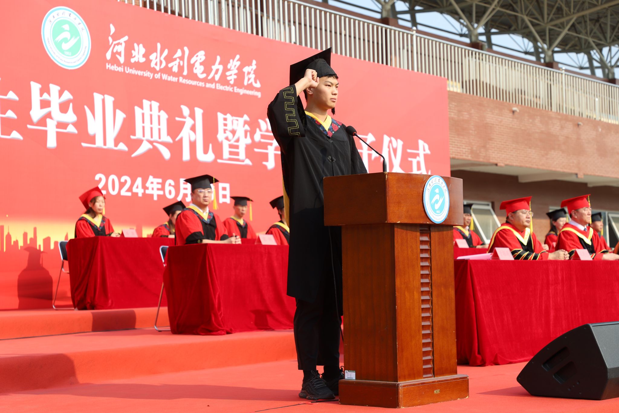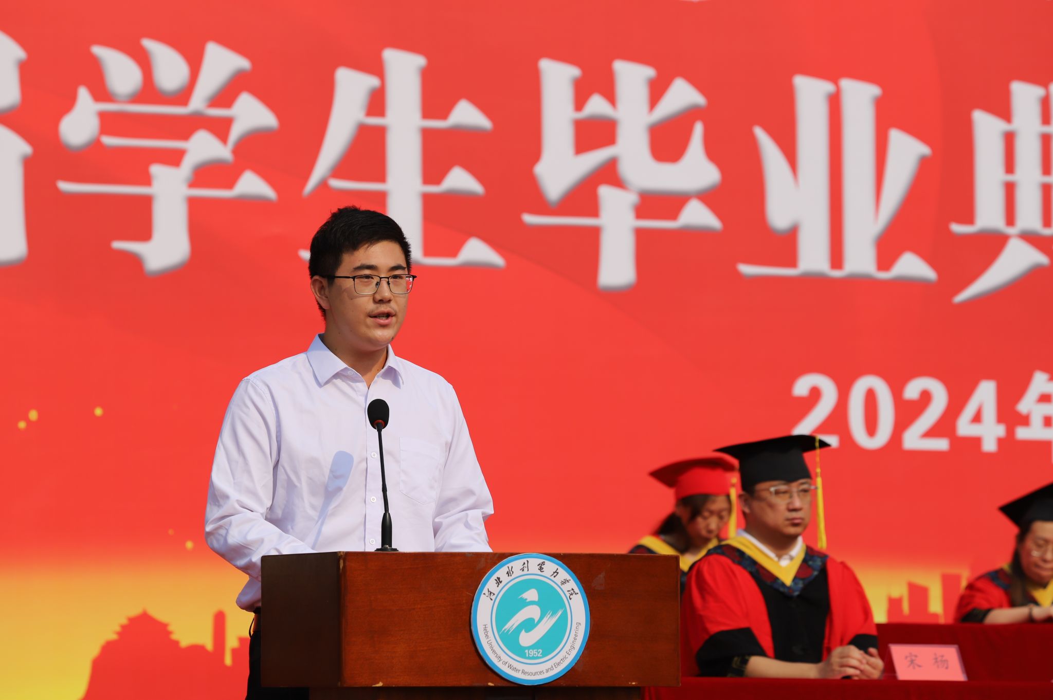 机械工程系机械设计制造及其自动化专业2004班史开红同学代表全体毕业生发言,既回顾了自己在大学里的成长历程和收获,也表达了对母校、老师和同学们的感激之情和美好祝愿,并带领全体毕业生进行了宣誓。电气自动化系自动化2303班张瑞鹤同学代表全体在校生发言,表达了对毕业生的祝福和敬意及对自己未来的憧憬和信心。河北省第二批高校“双带头人”教师党支部书记工作室负责人、土木工程系张云老师作为教师代表发言,深情表达了对同学们的不舍和祝福,希望同学们能够珍惜师生情谊,在今后的人生道路上不断学习,为社会做出自己的贡献。学校1997届电气工程系电力工程专业毕业生国网沧州供电公司副总经理、工会主席刘彦升同志作为校友代表发言,对学校的高速跨越式发展感到高兴和骄傲,并给学弟学妹们送上了美好祝福。