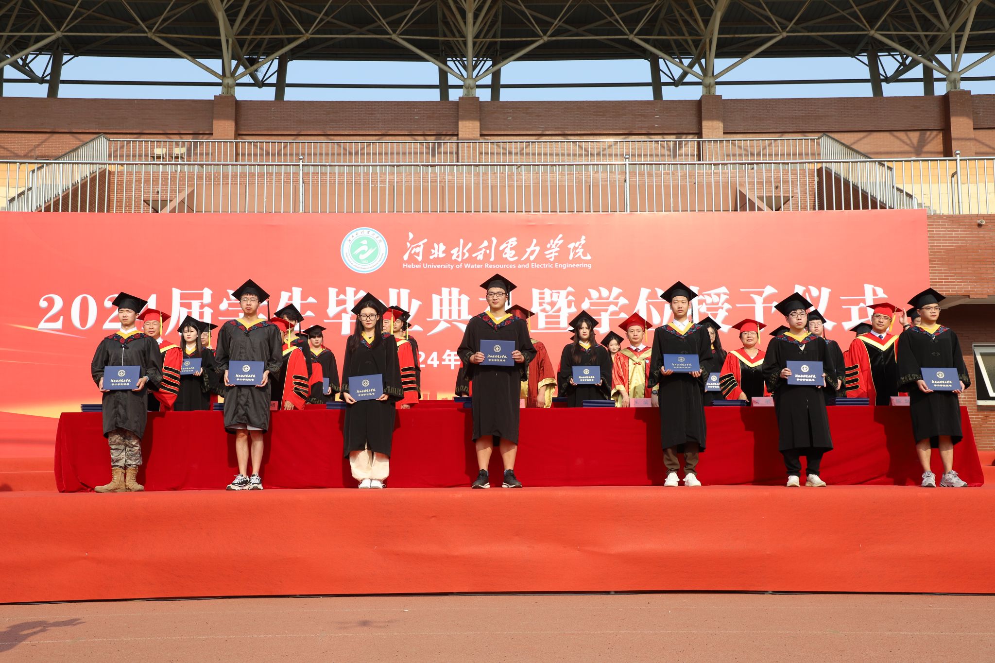 王建明宣读了8868·电子(中国)官方网站关于授予2024届本科生学士学位的决定。出席典礼仪式的领导、教师为2024届优秀毕业生代表拨穗正冠,颁发学位证书,并合影留念。