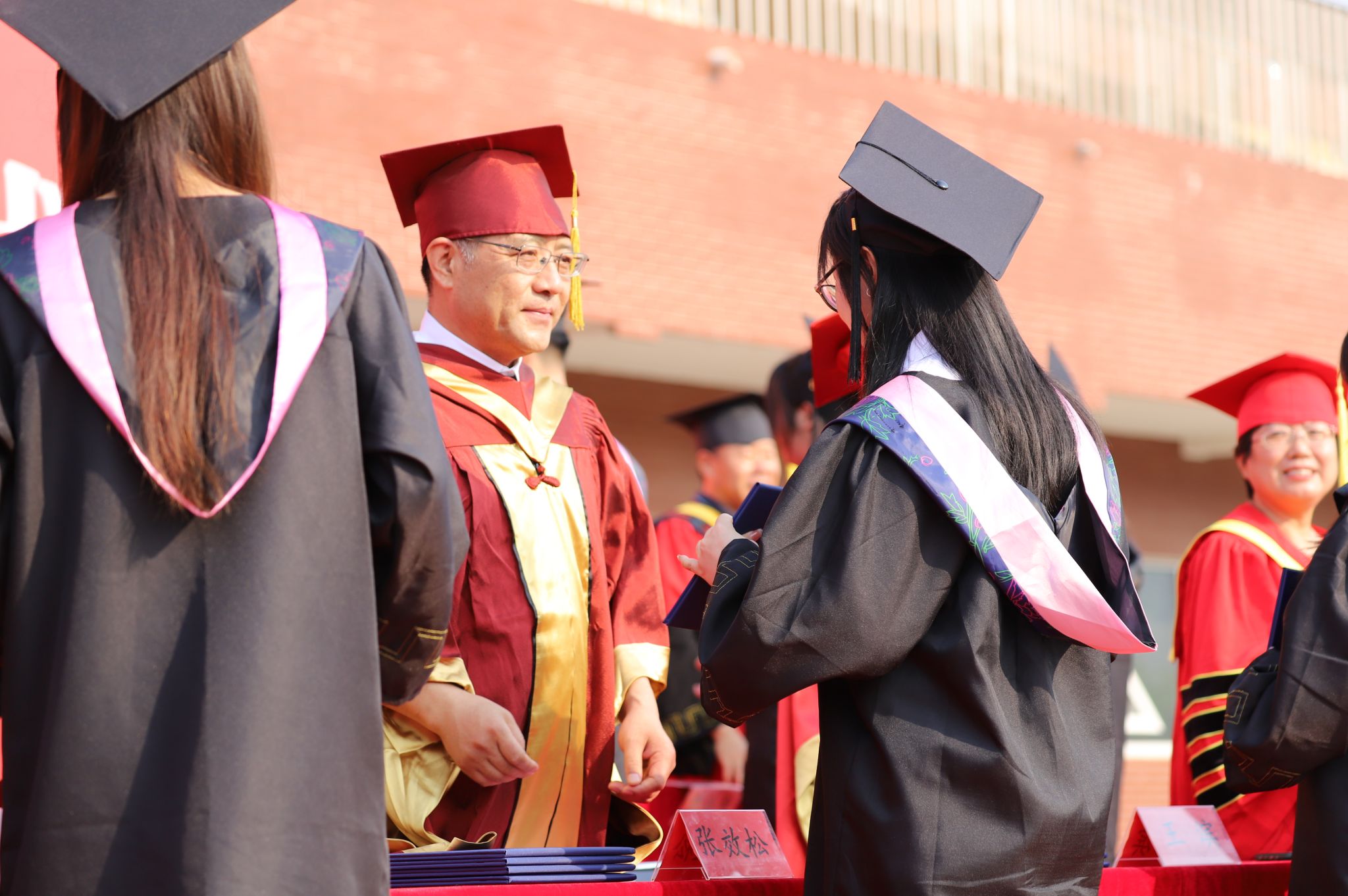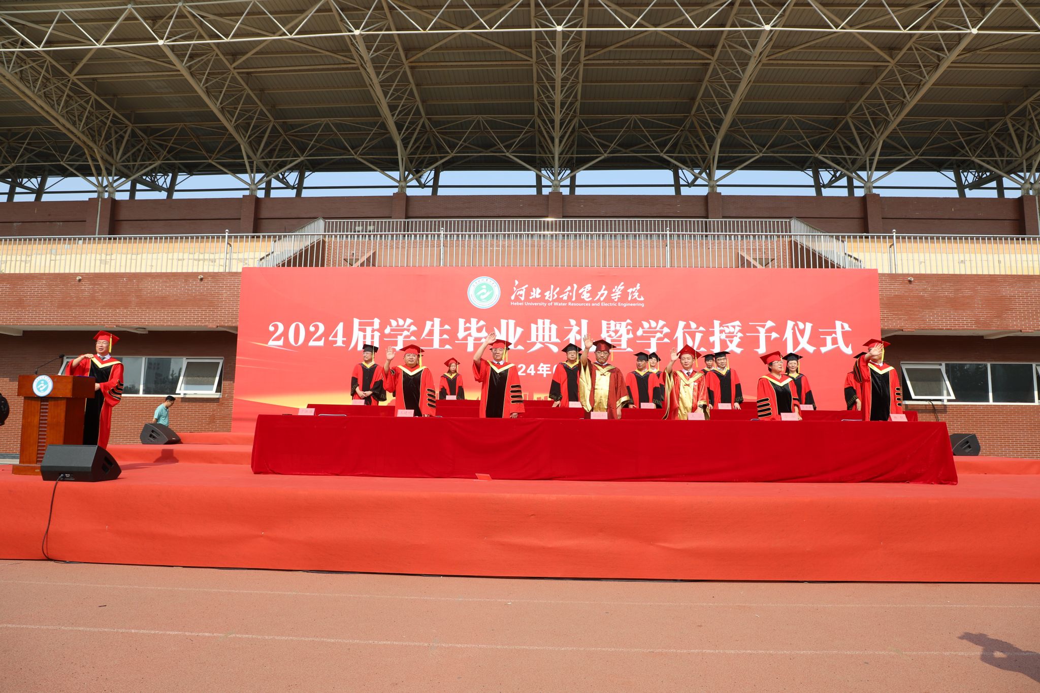 6月20日上午,我校在体育场举行2024届学生毕业典礼暨学位授予仪式。学校党委书记张效松,党委副书记、校长王滨,副校长崔立功,纪委书记方敏,副校长王建明,副校长杨凯出席仪式,各系主任及学校学位评定委员会委员、各系教师代表及毕业生代表共计1500余人参加毕业典礼。典礼仪式由副校长于振海主持。