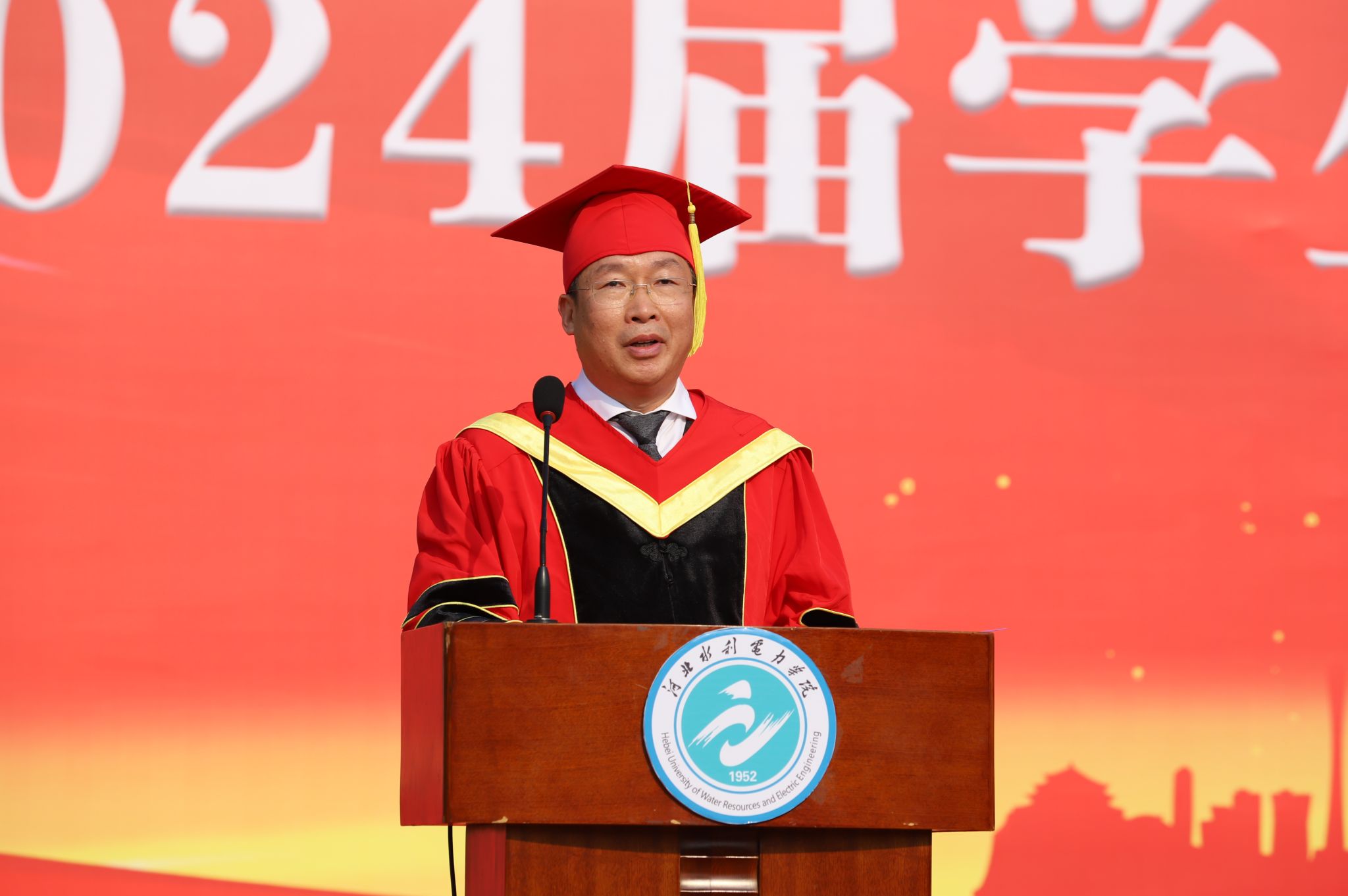 最后,王滨向2024届毕业生圆满完成学业表示热烈的祝贺,回顾了同学们极不平凡的四年大学生活以及学校的快速发展。王滨以“不负韶华致青春 扬帆起航向未来”作为临别赠言,对我校全体优秀学子提出了四点殷切期望和美好祝福。一是立鸿鹄之志,做大任之才;二是筑扛鼎之肩,修笃学之能;三是展奋斗之姿,踏锦绣之程;四是强身体之健,固拼搏之基。