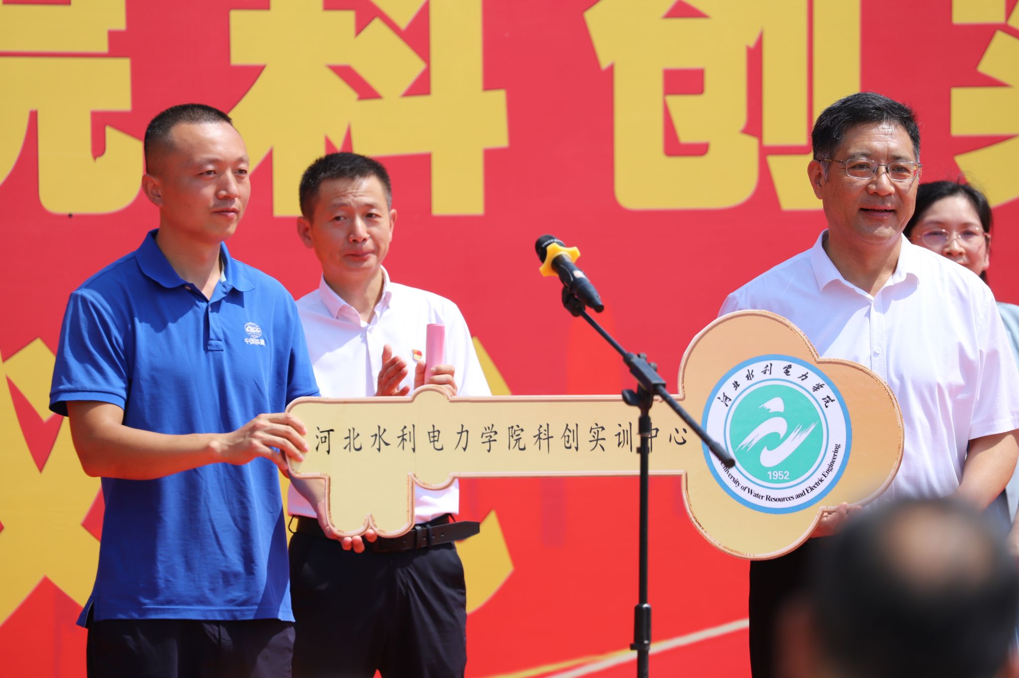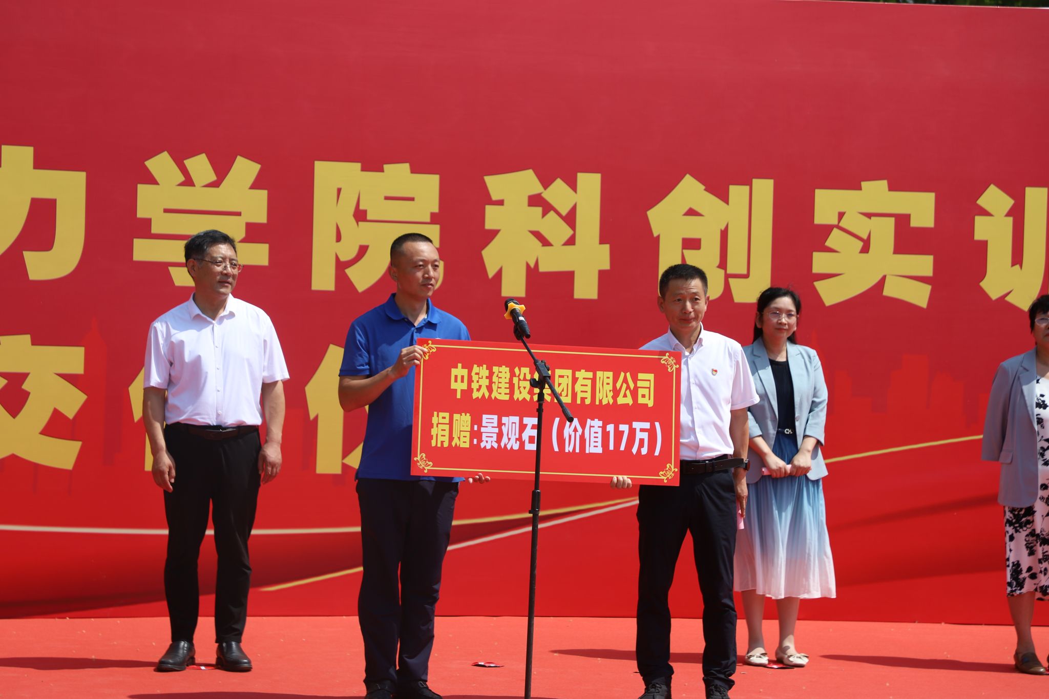 仪式上,项目建设指挥部综合组组长周学增,总包单位中铁建设华北公司第八项目部负责人李晓帅先后发言。监理单位中咨工程有限公司副总经理杨慧丽发表致辞。党委副书记、校长王滨向中铁建设华北公司颁发了景观石捐赠证书。党委书记张效松从李晓帅手中接过象征着工程竣工交付的科创实训中心“金钥匙”。