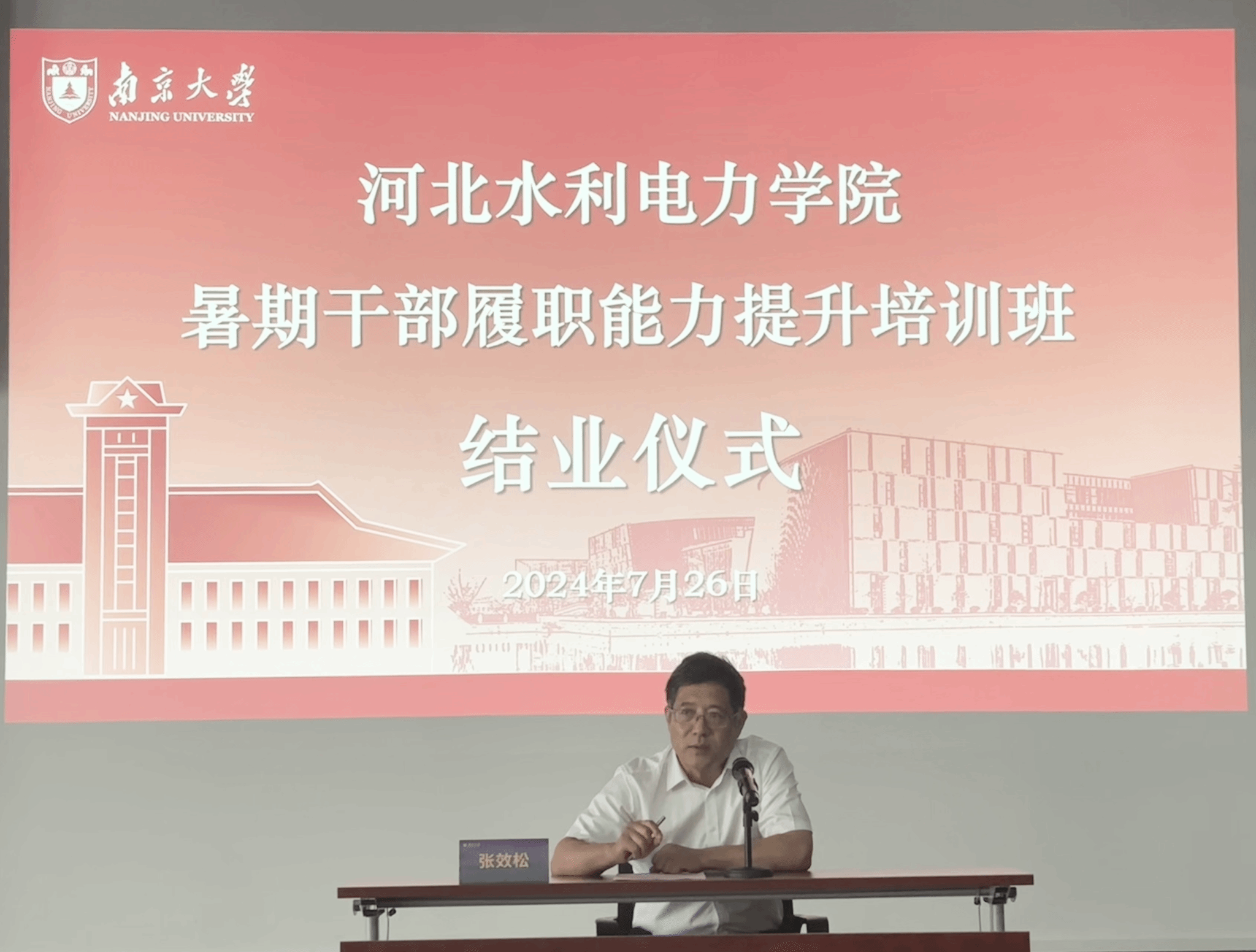 党委书记张效松在总结讲话中表示此次培训内容丰富、安排紧凑,取得了良好效果,达到了预期目的。他强调,要结合党的二十届三中全会精神,深刻领悟“两个确立”的决定性意义,深入学习贯彻习近平新时代中国特色社会主义思想,不断加强党对学校的全面领导;深刻认识教育在全面建设社会主义现代化国家中的基础性、战略性支撑作用,在立德树人的实践中回答好“培养什么人、怎样培养人、为谁培养人”这个根本问题;深刻认识创新在我国现代化建设全局中的核心地位,充分发挥高校作为国家战略科技力量的重要作用,融入国家创新体系,实现科技自立自强。他要求全体中层干部:一要自觉做政治上的“明白人”,二要自觉做业务上的“内行人”,三要自觉做落实的“实干家”。他对参加本次培训的学员顺利结业表示祝贺,并对南京大学终身教育学院给予本次培训的支持表示感谢。