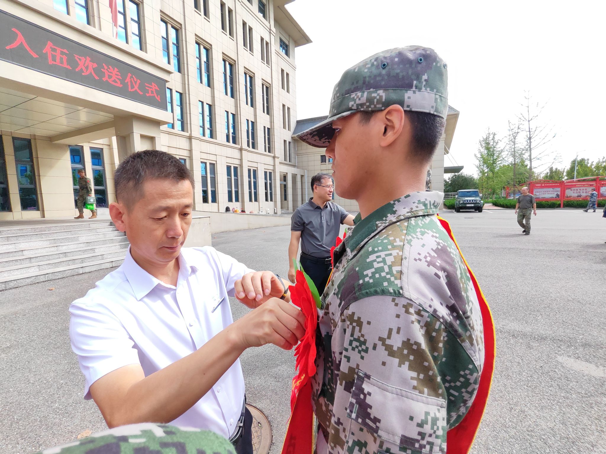 学校领导一行现场观摩了我校入伍新兵的役前训练成果。同学们身着迷彩服,精神抖擞,士气高昂,以饱满的热情、整齐划一的队列动作进行了汇报展示。展示结束后,校领导为入伍新兵佩戴参军光荣的绶带和大红花,向他们赠送了慰问品,同学们感受到来自母校的温暖和牵挂!