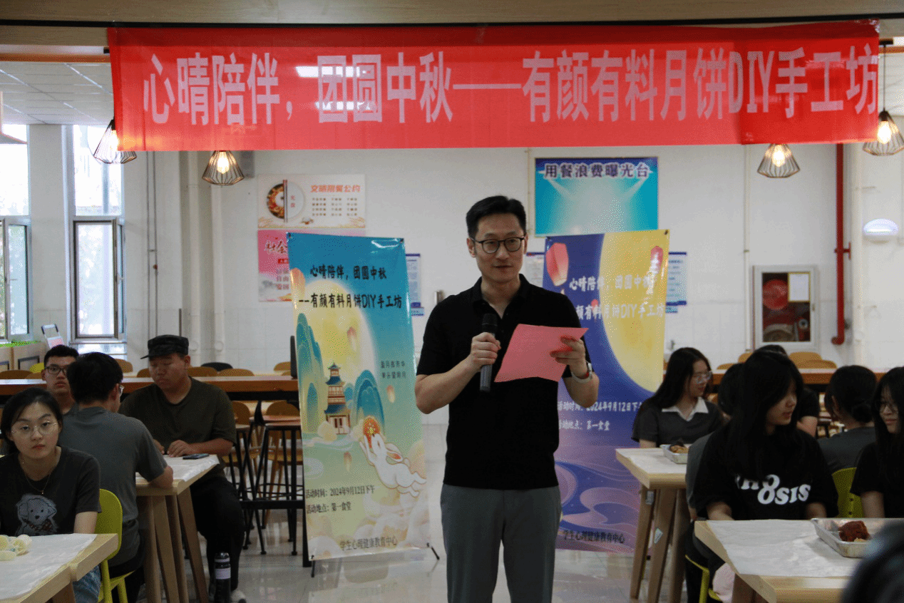 盈盈中秋月,悠悠团圆情。佳节将至,为弘扬中华优秀传统文化,增强学生对传统节日的认同感、参与感,进一步帮助2024级新生完成角色适应,融入大学生活,9月12日下午,我校学生心理健康教育中心为同学们举办了一场“心晴陪伴,团圆中秋——有颜有料月饼DIY手工坊”活动。副校长杨凯出席活动,活动由党委学生工作部副部长路鹏主持。