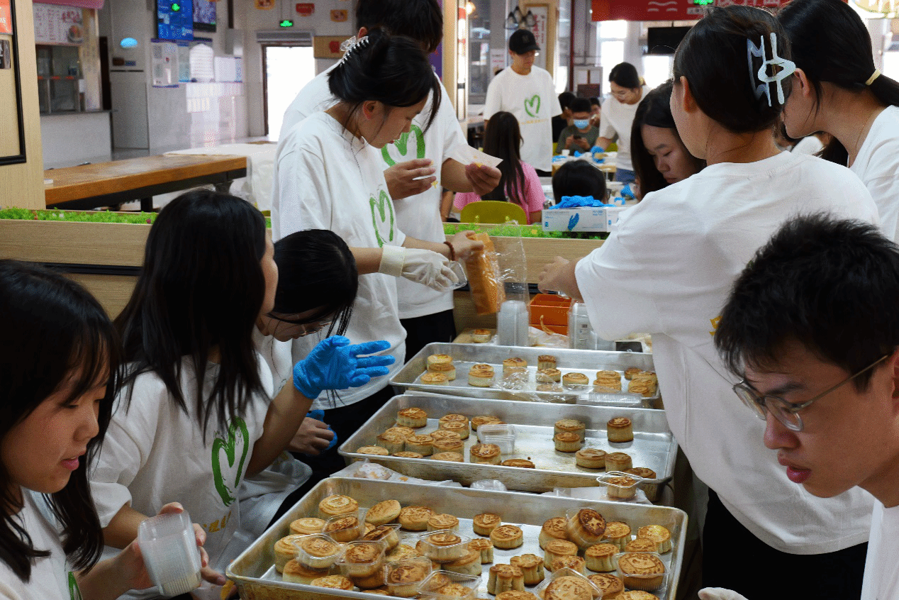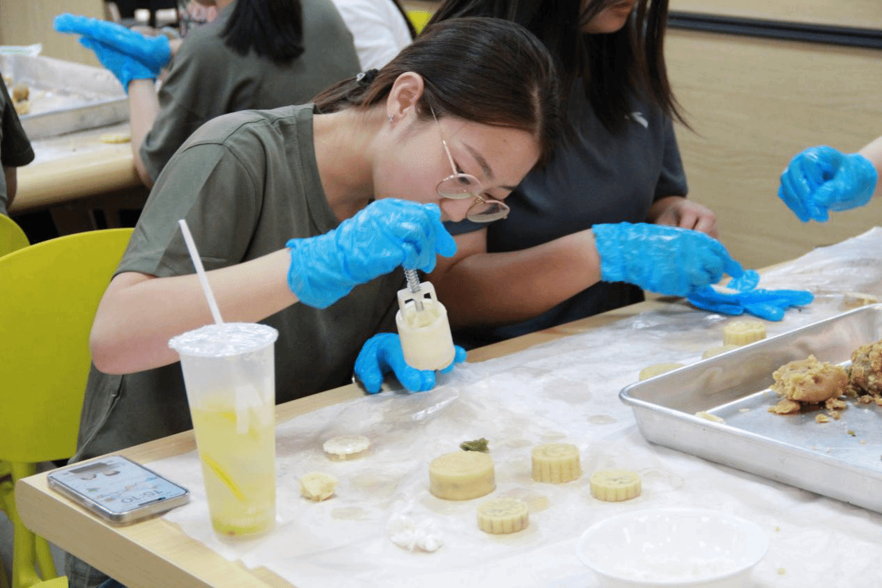 在心理健康教育中心老师的带领下,同学们踊跃参与,他们揉面团、包馅料,按压月饼模型,每个参与者的脸庞上都写满了专注。在大家的齐心协力下,精美的月饼最终出炉,吸引了广大师生驻足品尝。