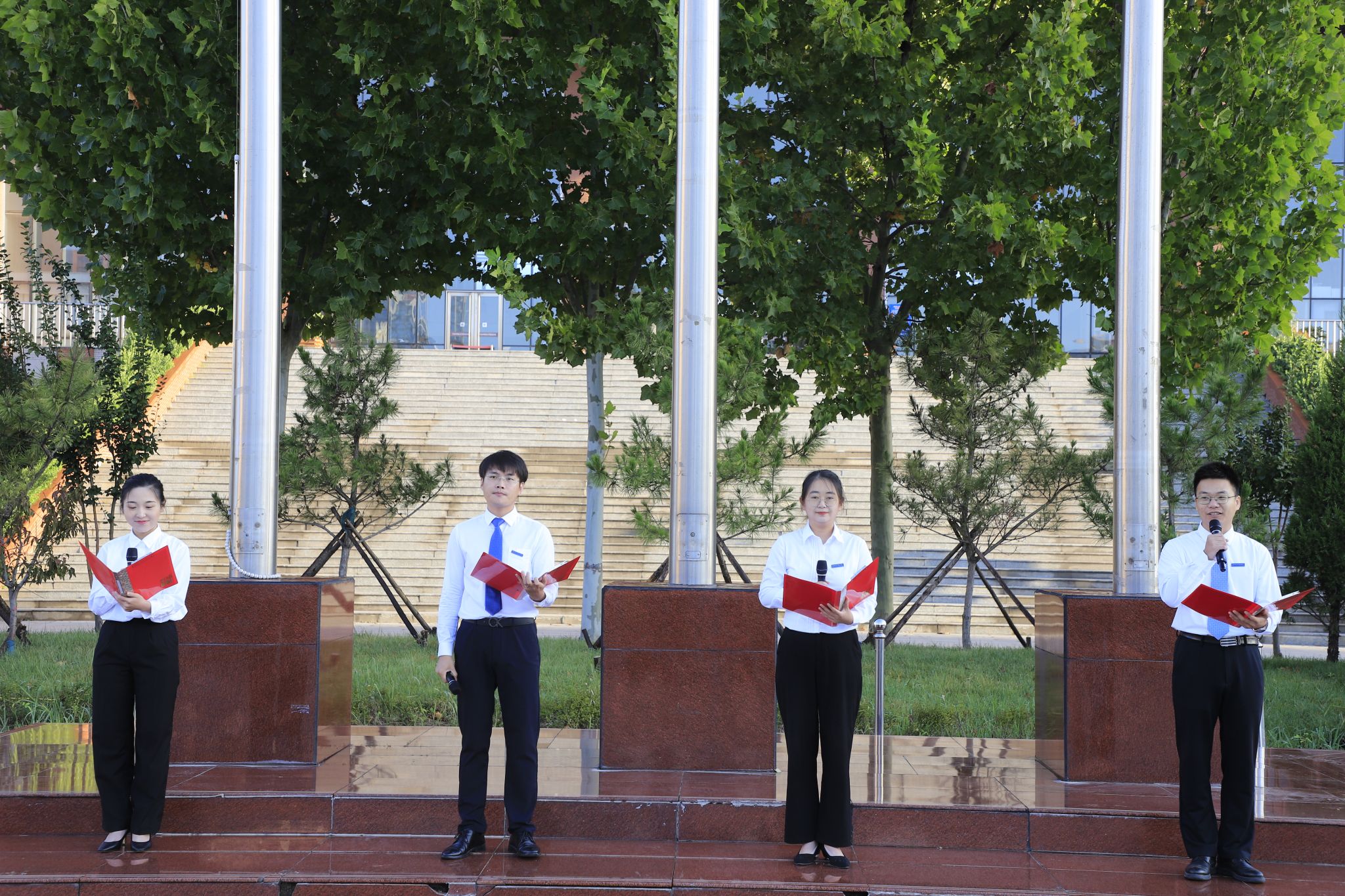 基础部尹梦田、计算机系杨阔、经贸系刘璐、机械系张浩四位老师带来国旗下的朗诵——《我和我的祖国》,抒发了水院人在强国强校的建设中自强不息、坚韧不拔的拼搏精神,展现了水院人兴水利民、强电报国的家国情怀。