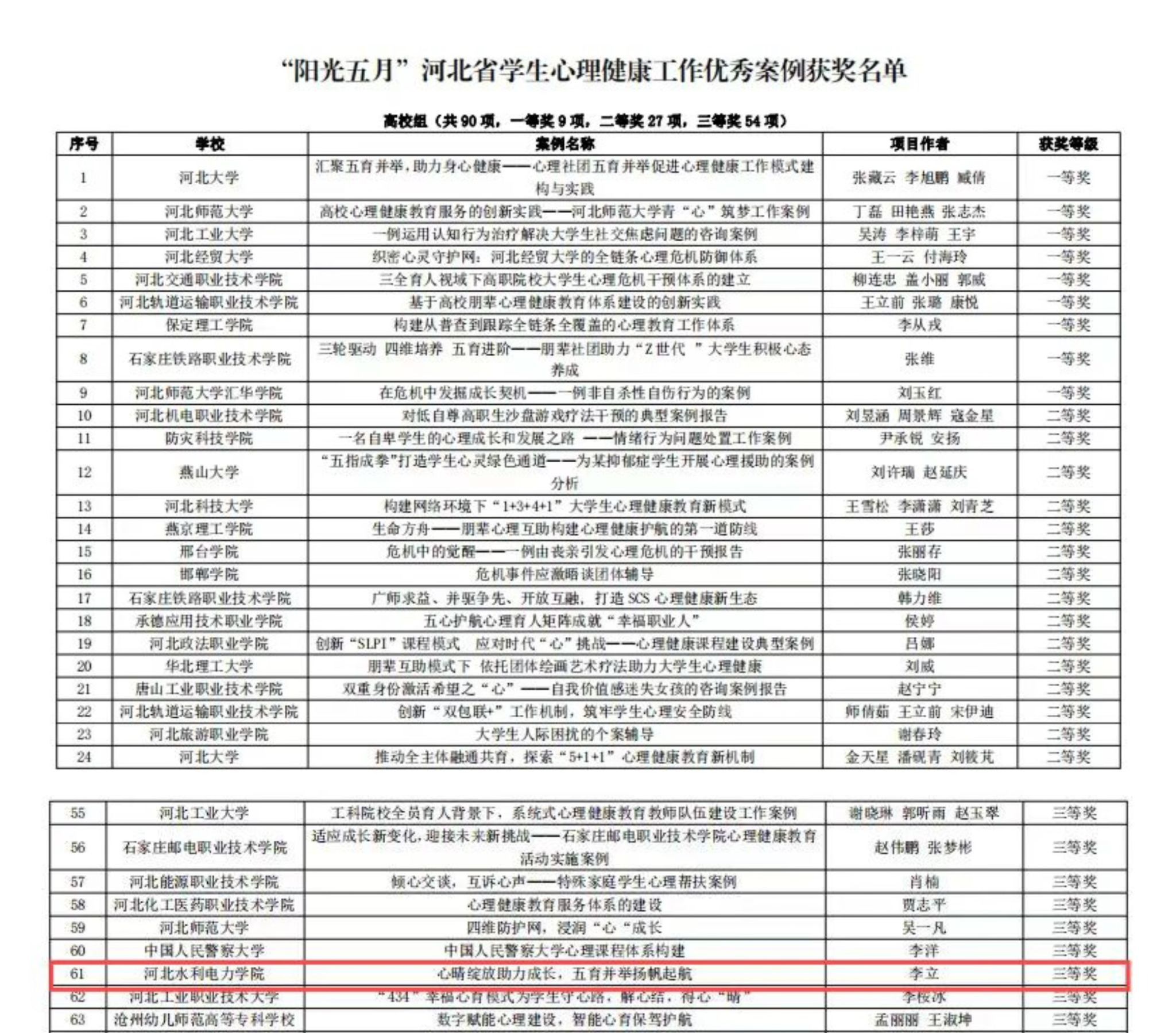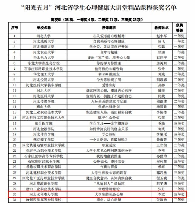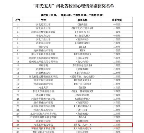 近日,河北省教育厅公布了首个河北省学生心理健康宣传教育月评选活动的结果,我校在河北省学生心理健康宣传教育月活动中喜获佳绩,李立老师的《心晴绽放助力成长,五育并举扬帆起航》《大学生的社恐心理》分别荣获学生心理健康工作优秀案例三等奖、学生心理健康大讲堂精品课程三等奖,王佳慧、寇玉婷老师的《再见,九岁!》荣获校园心理情景剧三等奖。