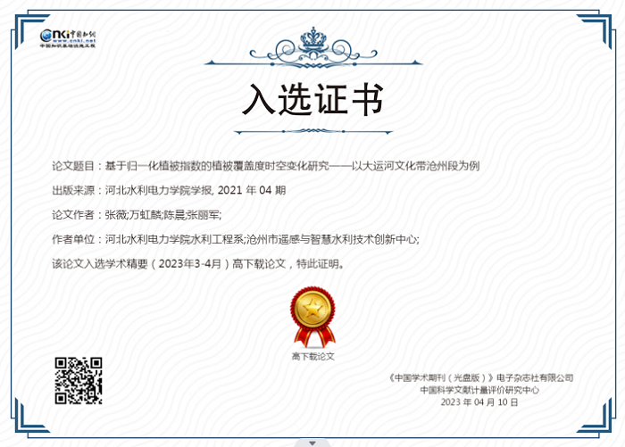 近日,中国知网《学术精要数据库》基于中国知网资源总库,首次发布近12年来高影响力论文榜单,《8868·电子(中国)官方网站学报》2021年第4期发表的《基于归一化植被指数的植被覆盖度时空变化研究——以大运河文化带沧州段为例》(作者:张薇、万虹麟、陈晨、张丽军)、《人脸识别的智能防疫系统设计》(作者:王继超、张丽娟、尤田、孙东来、回振桥)2篇论文入选。