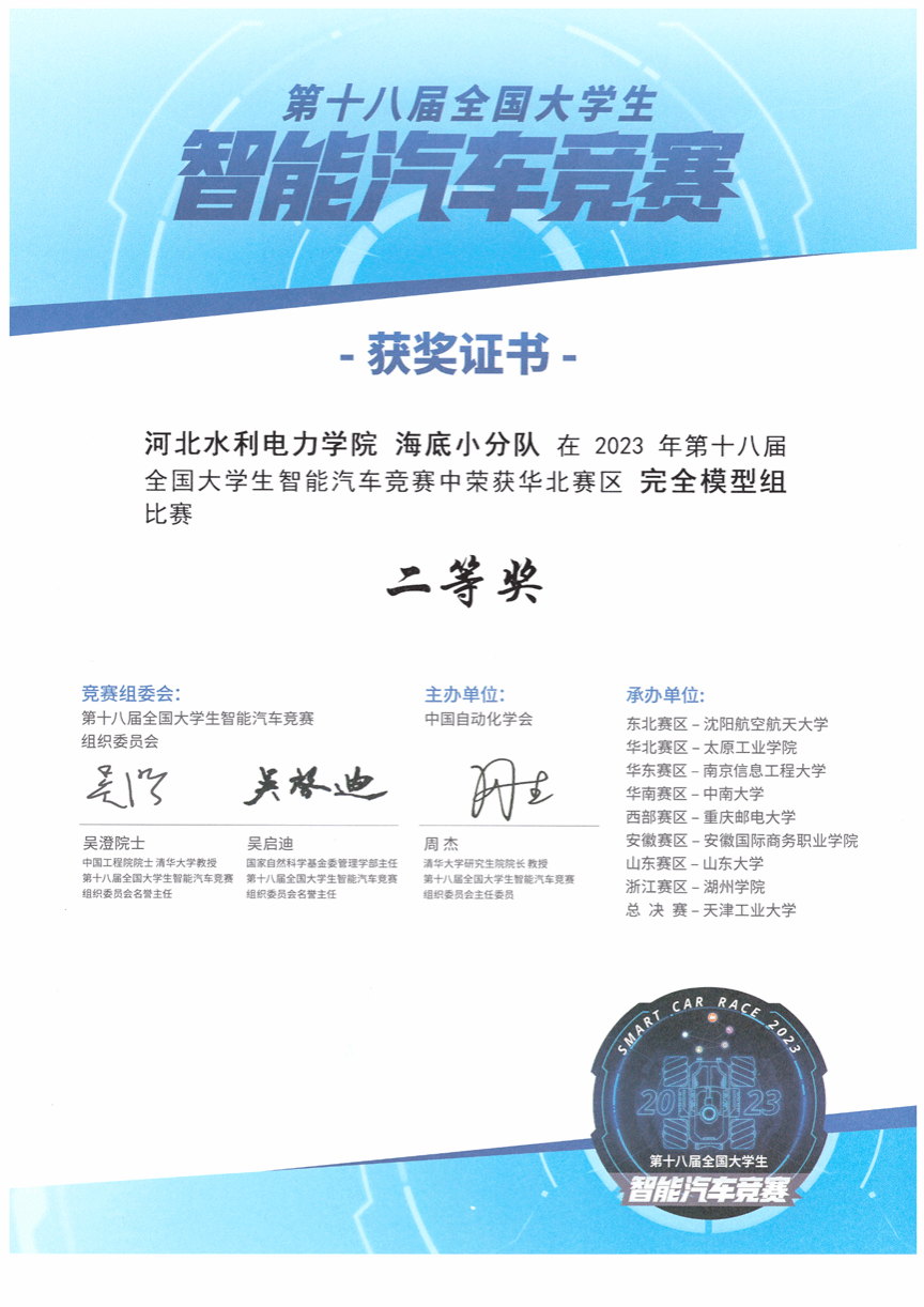 近日,第十八届全国大学生智能汽车竞赛华北赛区圆满结束,来自北京、天津、河北、河南、山西、内蒙的77所高校、327多支参赛队伍、1022名选手参加此次赛事。我系派出1支队伍、5名学生赴山西太原工业学院参加了完全模型组赛项,经过四天两轮次比拼,电气自动化系参赛队伍“海底小分队”荣获完全模型组华北赛区赛项二等奖。他们分别是2021级同学张小卫、周嘉源、董智,2020级学生廖志通、王文涛,王继超、回振桥担任指导老师,王继超、孙东来担任带队老师。