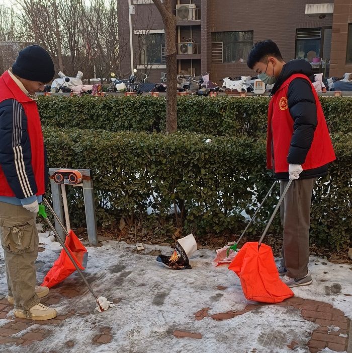 在活动过程中,志愿者们对小区的休闲场所、绿化带中的垃圾杂物进行了彻底清理,对楼道旁张贴的小广告进行了清除,将乱停放的电动车、自行车进行了规整摆放,并引导社区居民有序停车。即使天气寒冷,大家的热情依旧高涨,工作细致认真。在大家的共同努力下,社区环境焕然一新。志愿者们还在老师的带领下向社区居民分发宣传手册,积极宣传全国文明城市创建知识,共同营造“全民行动,共创文明城市”的浓厚氛围。